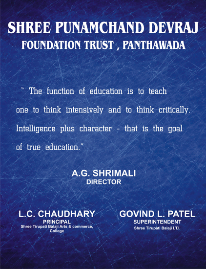 Shree Tirupati Balaji Arts And Commerce College, Panthawada an autonomous institution registered Under Trade Mark Symbol Registry Department, Govt.Of India. Reg. No. 1029 B.K. is a well established Computer skills training institute and we have been training a diverse range of students around the Globe successfully, also registered byThe Rajasthan Societies Registration Act, 1958. Under Govt. of India NCT New Delhi, An ISO 9001:2015 Certified Organization, Which provide it perfect computer education. The importance of computer education is well known to all. It is technology part and parcel of our daily life, whether it is in the field of College, office or education institute.